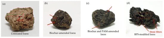 Visual comparison of soil aggregates with and without biochar, PAM, and straw fiber modifications: (a) untreated soil, (b) biochar-amended soil, (c) biochar and PAM-amended soil, (d) BPS-modified soil.