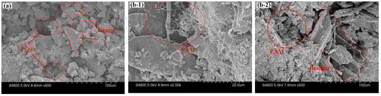Figure 14 presents the SEM microstructures of untreated and treated samples with 3% BPS. For the untreated case (Figure 14a), a highly porous structure, characterized by weak interparticle cohesion and an overall loose configuration, was distinctly observed. Clear particle boundaries, irregular pore distributions, and large voids were revealed. The particles were primarily bonded through weak capillary forces and minimal physical interaction, which inherently resulted in poor compressive strength, rendering the soil susceptible to fracture and deformation under applied load [].