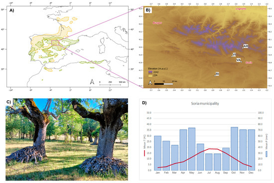 (A) Distribution range of the main sampled species, Q. pyrenaica and Q. faginea [29]. (B) Locations of the four studied pollarded woodlands (AR, RI, VA, VI), with surrounding major cities in Spain. Digital Terrain Model source: PNOA 1:200,000 ETRS89 HU30 Soria. (C) Picture of recently pollarded Quercus pyrenaica oaks at the Vilviestre site. (D) Thirty-year ombrothermal diagram of the municipality of Soria to represent the regional context (period: 1981–2020; data source: Spanish State Meteorological Agency).