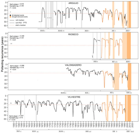 Temporal evolution of pollarding recurrence at the site level shown as a black solid line (computed for a 10-year anchored moving window at the focal year). The y-axis has been reversed for better interpretation, with a value of 1 year indicating the highest recurrence and infinity years indicating the least recurrence. The y-axis is truncated at the P90 value of the entire database (63 years). The gray-shaded periods highlight times when the recurrence values exceed this truncation threshold. Bars represent the number of pollarding events by decade at each site, centered by decade. The overall median of the site is shown as a red dotted line. Each panel corresponds to one study site. Statistical differences between sites and centuries are indicated by different letters (Dunn test, p < 0.05). The results of the temporal trend analysis are displayed in the top-left corner. The additional orange line represents recurrence data for the 20th and 21st centuries, excluding the potential confounding effect of severe droughts.