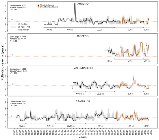 Temporal evolution of pollarding severity (smoothed using a 10-year rolling median) shown as a black solid line. The overall median of the site is shown as a red dotted line. Shaded area indicates the interquartile range (smoothed using a 10-year rolling P25 and P75). Each panel corresponds to one study site. Statistical differences between sites and centuries are indicated by different letters (Dunn test, p < 0.05). The results of the temporal trend analysis are displayed in the top-left corner. The additional orange line represents severity data for the 20th and 21st centuries, excluding the potential confounding effect of severe droughts.