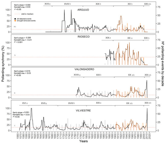 Temporal evolution of pollarding synchrony shown as a black solid line (computed for 10-year anchored moving window at focal year, at site level). Maximal synchrony is represented at a value of 100. Bars show the number of pollarding events by decade at each site, centered by decade. The overall median of the site is shown as a red dotted line. Each panel corresponds to one study site. Statistical differences between sites and centuries are indicated by different letters (Dunn test, p < 0.05). The results of the temporal trend analysis are displayed in the top-left corner. The additional orange line represents synchrony data for the 20th and 21st centuries, excluding the potential confounding effect of severe droughts.