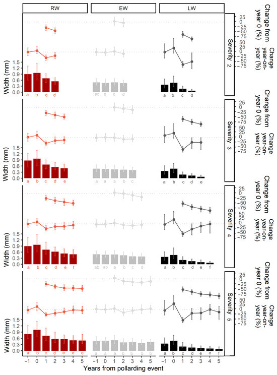 Year-on-year change in ring width (RW), earlywood (EW), and latewood (LW) from one year before pollarding to five years after in primary pollarding events (bar charts). The upper line chart displays the percentage change relative to the pre-pollarding conditions (year 0). The lower line chart displays the year-on-year percentage change. Time span covers the most common number of years in which the effects of pollarding were observed (P90 = 5 years). Columns or dots represent the median; whiskers indicate the interquartile range. Statistical differences between years are indicated by different letters (Wilcoxon test for paired samples, p < 0.05).