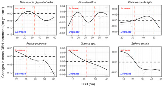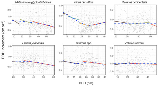 The results of the longitudinal analysis revealed that the averaged DBH increment patterns of Prunus yedoensis, Quercus spp., and Z. serrata increased up to a certain DBH and then declined (Figure 2). In contrast, the averaged DBH increment patterns of M. glyptostroboides, Pinus densiflora, and Platanus occidentalis displayed more complex patterns: they initially decreased, increased, and then again decreased at larger DBH values (Figure 2). Discrepancies in the DBH increment patterns were observed when these longitudinal results were compared to those of the cross-sectional analysis. Generally, for the segments where the longitudinal analysis revealed an increasing pattern, the cross-sectional analysis often failed to demonstrate a corresponding positive pattern.