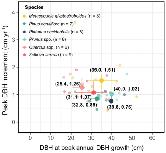 Two-dimensional plot of the peak diameter at breast height (DBH) increment of different tree species. The points indicate the median value of DBH (x) and DBH increment (y) at the peak growth. “n” indicates the number of samples where individual-level generalized additive model (GAM) regression identified local maxima points.