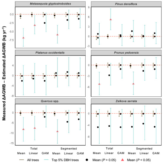Differences between the measured and estimated above-ground woody biomass increments (ΔAGWB) by species, methods, and tree-size class (all and top 5% DBH). Red triangles indicate statistical differences between the measured and estimated values (p < 0.05). The red dash line represents the zero line.