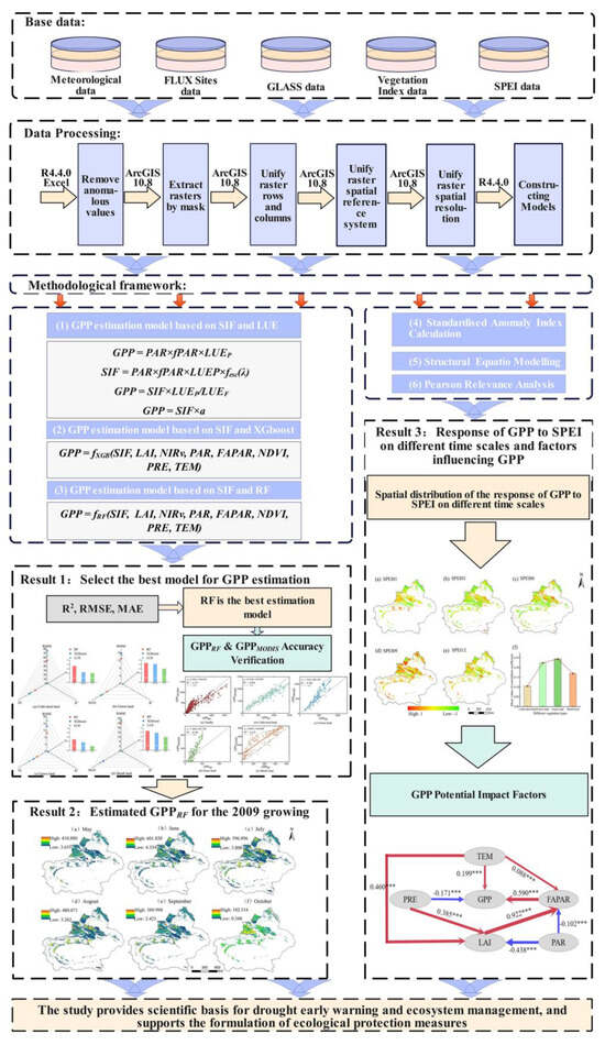 For Xinjiang, we comprehensively assessed the performance and precision of three GPP estimation models—LUESIF, XGBoost, and RF. This comparison relies on datasets derived from diverse sources, including flux tower data, GOSIF, NIRv, and LAI. By analysing the coefficients of determination (R2), root mean square error (RMSE), and mean absolute error (MAE) of the three models, we established an optimal estimation model for different vegetation types. In addition, we explored the response of GPP to SPEI across different timescales during a typical dry year. Furthermore, we clarified the potential pathways and influence coefficients of major natural factors affecting GPP in arid zones. These results are of significant importance for assessing the health status of ecosystems in arid zones. They can also establish a scientific foundation for ecological rehabilitation and resource management strategies. The technical framework is shown in Figure 2.