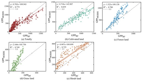 We conducted a validation process to ascertain the precision and applicability of the RF model for estimating the GPP in Xinjiang; this involved the random selection of 200 sample points for each vegetation type to ensure a comprehensive and representative dataset for analysis. We then compared the RF model estimation results for these sample points with the corresponding pixel values derived from the MODIS GPP product (Figure 4). Our findings revealed a strong concordance between the RF model estimates for the four vegetation types and the GPP product, with R2 values > 0.700. Specifically, the cultivated land model achieved an R2 value of 0.839, significantly surpassing those of the other three vegetation-type models. In contrast, the shrub land model had an R2 value of 0.725, slightly lower than those observed for the other vegetation types. In summary, the correlation between GPPRF and GPPMODIS for vegetation in Xinjiang reached 0.775, indicating that the RF model is highly effective in estimating GPP in the arid zone of Xinjiang and holds great promise for ecological monitoring and assessment on a regional scale.
