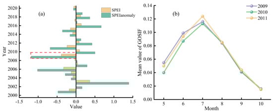 (a) Trend changes in SPEI12 before and after standardised anomalies (2001–2020); (b) trend changes in mean GOSIF values during the growing season (2009–2011) (the red box represents the most anomalous year, 2009).