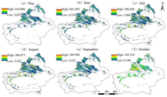 GPP exhibited a unimodal pattern of variation during the 2009 growing season in Xinjiang, peaking at 82.189 gC m−2a−1 in July (Figure 6); this was primarily attributed to the high summer temperatures, abundant precipitation, and robust photosynthesis of Xinjiang vegetation. However, as drought intensity increased, the GPP exhibited a declining trend. First, persistently high temperatures reduce stomatal conductance in vegetated leaves, contributing to a decline [54]. Second, in arid areas experiencing water scarcity, plants regulate their stomata to minimise water loss, decreasing vegetation GPP [55].
