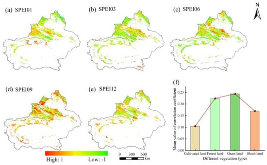 (a–e) Spatial distribution of GPP in response to SPEI at different timescales in 2009; (f) correlation coefficients between vegetation GPP and SPEI09 in 2009.