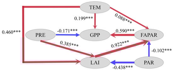 Path analysis of the impact of PRE, TEM, LEI, PAR, and FAPAR on GPP (red and blue indicate positive and negative influences, respectively; arrow thickness represents the degree of influence, where the thicker the arrow, the greater the influence. *** represent p < 0.001).