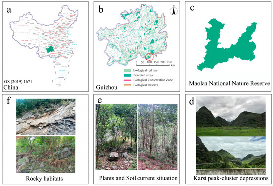 Overview of the study area. (a) Location of the study area. (b) Map of natural resource distribution in Guizhou Province. (c) Boundary map of the Maolan National Nature Reserve. (d) Karst peak-cluster depressions in Maolan. (e) Plants and soil: current situation in Maolan. (f) Current status of the rocky habitats in the study area.
