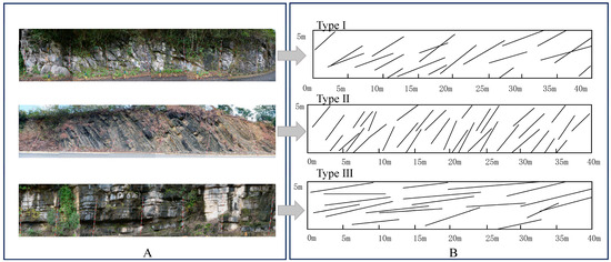 Planar Network Models of Rock Fracture Structures for Three Types of Rocky Habitats. ((A): Schematic diagram of the rock fissure network in the field, (B): Digital image of the rock fissure network after digitization).