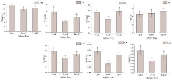 Soil nutrient content across three types of rocky fissure network habitats. (Note: Different lowercase letters indicate significant differences between habitat types at p < 0.05.).