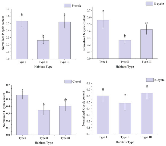 Normalized soil nutrient content values in C, N, P, K cycles across three types of rocky fissure network habitats. (Note: Different lowercase letters indicate significant differences between habitat types at p < 0.05).