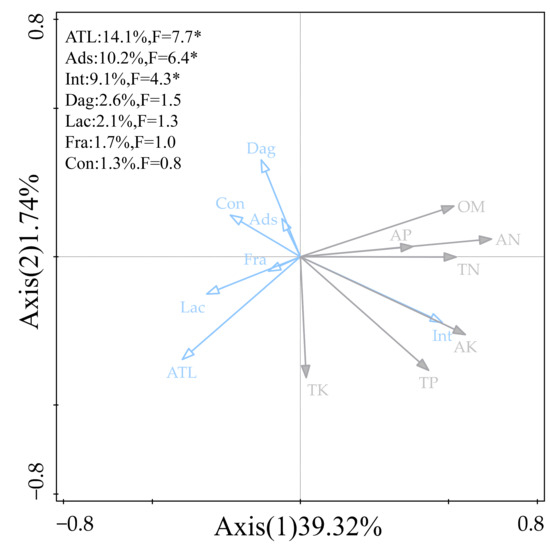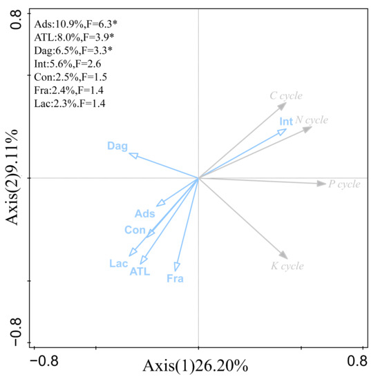 RDA analysis results of nutrient cycles in soil and rocky habitat indicators (* indicates p < 0.05).