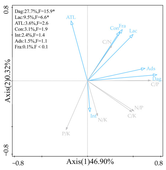 RDA analysis results of soil nutrient stoichiometry ratios and rocky habitat indicators (* indicates p < 0.05).