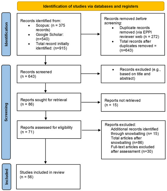 The selected articles were then subjected to a full-text evaluation, which included conference papers and excluded articles not available in full text through academic subscription or authorized dissemination by the authors. This narrowed the selection to 71 papers. To further enrich the review, additional literature was sought by examining relevant references within the selected articles, via a snowball approach, thus leading to the inclusion of 15 more articles. These additional articles were also screened according to the previous criteria. In total, 86 articles were initially compiled. Of these, 30 articles did not meet the criteria and were excluded, resulting in a final selection of 56 articles (see Table S1 within Supplementary Materials).