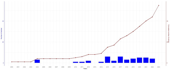Number of articles published on a yearly basis (bars) and as a total (line) between 2000 and 2023 (data for 2023 are incomplete and therefore not included in the figure).