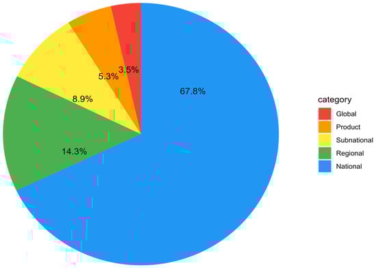 Macroscale MFA analyses largely prevail, representing about 95% of all studies considered, while product-level evaluations cover the remaining proportion (5.3%). Approximately 68% of the studies analyzed in this survey are national-level evaluations. followed by regional-level evaluations (14.3%), sub-national-level evaluations (8.9%), and global-level evaluations (3.5%) (Figure 3).