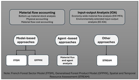 Material flow and agent analysis. Material flow analysis, as defined by ref. [87], is a quantitative technique used to monitor the movement and accumulation of materials within a given system, such as a geographical area, an industry, or a product life cycle. This approach considers material flows in terms of agents (e.g., industries, sectors) and their interactions. It allows detailed analysis of specific components within a system, such as the behavior of individual firms or the impact of regulatory changes. It provides a comprehensive view of resource use and waste production within the system under study. Agent analysis, also known as Structural Agent Analysis, is a complementary MFA approach that examines the influence of different actors or ‘agents’ in shaping material flows [88]. It assesses how the actions, decisions, and interactions of different agents (e.g., producers, consumers, policymakers) affect the patterns of material consumption and handling within the system. For example, ref. [87] applied this methodology in Switzerland for analyzing the wood-based value chain, demonstrating how MFA can offer insights into sector-specific resource management. Similarly, ref. [89] conducted a study across Slovakia, Italy, and Austria from 2008 to 2014, using MFA along with a Strength, Weaknesses, Opportunities, and Threats (SWOT) analysis to evaluate the environmental impacts of the wood value chain. Combining MFA and SWOT analysis, as exemplified by ref. [89], offers a holistic perspective by integrating environmental and organizational factors, thus providing a robust framework for evaluating both material flows and strategic factors impacting sustainability.