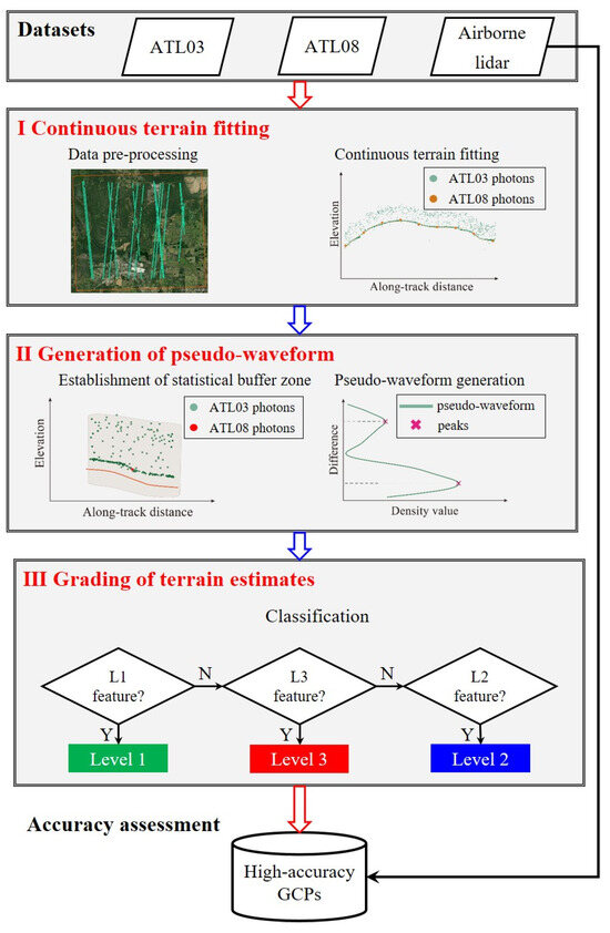 To extract high-accuracy GCPs from ICESat-2 ATL08 data, the proposed method consists of three primary components, as shown in Figure 2.