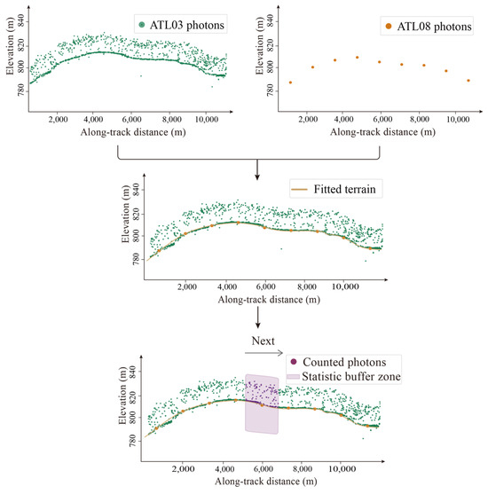 After performing terrain fitting, we established a statistical buffer zone that can be adaptively adjusted based on the terrain changes at each ATL08 ground point. This buffer was defined using a window with an along-track length of 40 m and a vertical height of 40 m, and parameters were empirically determined based on the local terrain and forest height within the study area. Specifically, the vertical buffer size was designed to encompass all tree height classes within the study area, which were preliminarily estimated according to ATL08 forest height data. The along-track buffer size was chosen considering local terrain features and the number of photons available. Further, the vertical buffer size can be dynamically adjusted to reflect changes in the local terrain. A similar idea was used in [46], where it was utilized to estimate the diffuse attenuation coefficient of water using ICESat-2 data. The resulting statistical buffer zone, illustrated by the purple rectangle of Figure 3, effectively captures the majority of objects under normal terrain conditions. This preserves the critical features of photon distribution while excluding noise interference. The buffer zone is mathematically represented as: