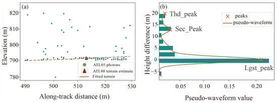 (a) Distribution of the ATL03 photons within a statistical buffer zone; (b) schematic representation of the pseudo-waveform, displaying three largest peaks: Lgst_peak, Sec_peak, and Thd_peak.
