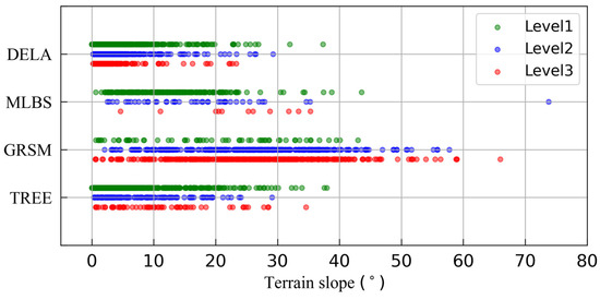 In the case of L3 estimates, the RMSE in three study areas (DELA, MLBS, and TREE), is more than double that of the pre-graded terrain estimates. In particular, the RMSE of MLBS exhibits the largest increase, more than three times that of the original terrain estimates. This result indicates that the proposed method is effective in identifying outliers. Regarding the L2 terrain estimates, their accuracy lies between the L1 and L3 estimates, supporting the validity of the grading strategy proposed in Section 3.3. These findings can be summarized as follows: (1) in regions with relatively flat or uniform slope variations, such as MLBS, the proposed method can effectively remove outliers (i.e., L3 terrain estimates); (2) in regions with significant terrain slope variations, like GRSM, the grading strategy successfully identifies high-accuracy elevation control points (i.e., L1 terrain estimates).