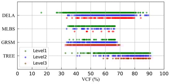 Figure 5 and Figure 6 illustrate the distribution of ATL08 terrain estimates across varying terrain slopes (derived by airborne lidar DTM) and vegetation coverage conditions (derived from the VCF data). All three levels of terrain estimates are present across terrain slopes and canopy densities. Furthermore, the terrain and vegetation coverage conditions did not exhibit a systematic effect on the distribution of terrain estimates. These findings demonstrated that the proposed method is minimally influenced by the aforementioned two factors (i.e., terrain slope and vegetation coverage), highlighting its robustness in different environmental contexts.