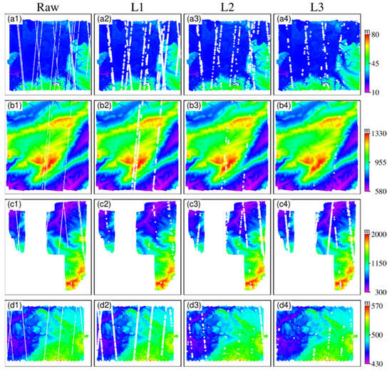 Distribution of raw ATL08 terrain estimates and graded estimates L1~L3 in the study area of (a1–a4) DELA, (b1–b4) MLBS, (c1–c4) GRSM, and (d1–d4) TREE. White dots in the images represent the ICESat-2 data points.