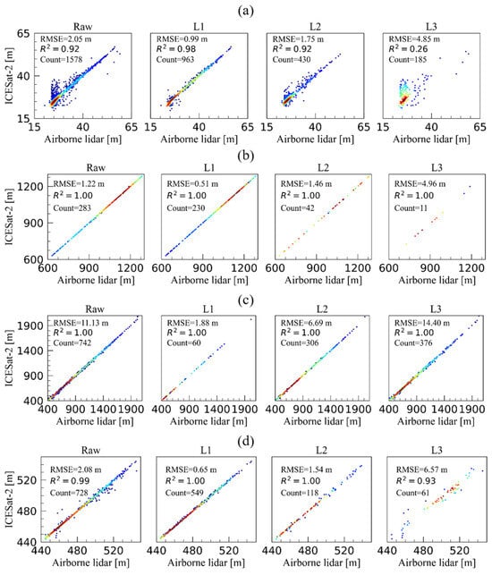 Scatterplots of both raw and graded ATL08 terrain estimates (L1~L3) in (a) DELA, (b) MLBS, (c) GRSM, and (d) TREE.