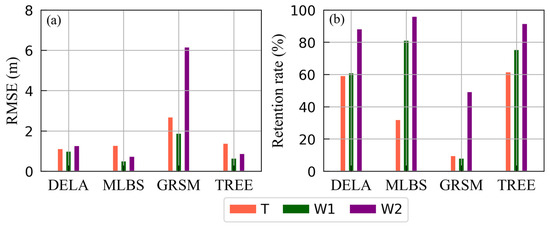 (a) RMSE and (b) data retention rate of the terrain estimates graded by our proposed method and the threshold-based method. T represents the L1 estimate achieved by the threshold-based method. W1 represents our proposed method’s L1 estimate, while W2 indicates its combined L1 and L2 estimates.