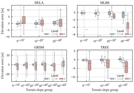 Statistical distribution of elevation errors in different terrain slope classes at three accuracy levels. For each slope class, the boxplot illustrates the minimum, maximum, median, first, and third quartile values of the data over each accuracy level.