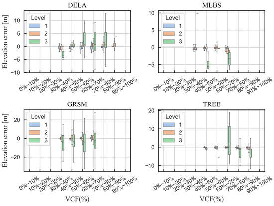 Statistical distribution of elevation errors in different terrain VCF classes at three accuracy levels. For each slope class, the boxplot illustrates the minimum, maximum, median, and first and third quartile values of the data at each accuracy level.