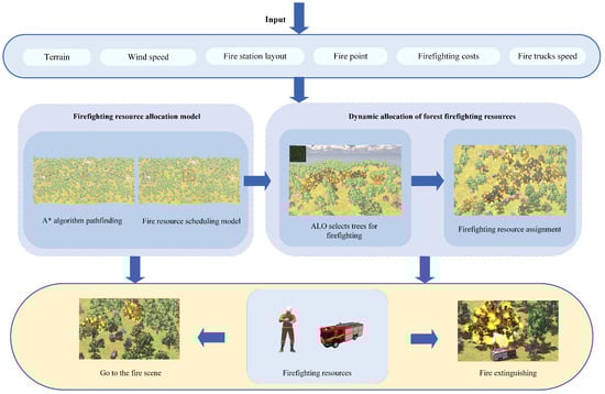 When firefighting resources arrive at the fire scene, the ant lion optimization (ALO) algorithm is initially employed to incorporate firefighting weighted factors, including the continuity of burning trees, wind direction, and distance from firefighting resources, to compute the optimal list of target trees for firefighting. Following this, the task allocation of firefighters is dynamically adjusted based on the real-time fire conditions and the optimal list of firefighting targets. A data structure is used to store the allocation relationships between firefighters and their assigned target trees. During each update, the status of firefighters’ tasks is reviewed, and the allocation is adjusted to ensure that firefighters are always directed to extinguish the most optimal trees. Figure 2 below illustrates the process of the proposed method.