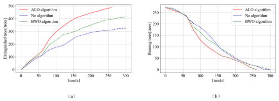 In this experiment, the dynamic allocation of forest firefighting resources was simulated and analyzed using a time step of 20 s. As shown in the real-time burning and extinguished tree number curve in Figure 7, the improved ant lion algorithm significantly reduced the firefighting time compared with the other two schemes, with an average reduction of about 40 s. Additionally, the number of trees extinguished by the improved ant lion algorithm within the same time frame is notably higher.