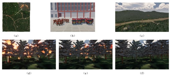 The complete process of three-dimensional visualization of firefighting decision-making; (a) shows a bird’s-eye view of forest fire resource dispatch, with the fire scene located in the upper right corner; (b) illustrates the fire resource model dispatched from the fire station; (c) depicts the pathfinding process of the firefighting resources en route to the fire; (d) represents the fire extinguishing visualization after the firefighting resources arrive at the scene; and (e,f) show the fire extinguishing process.