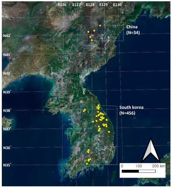 The study sites included parts of South Korea and the Manchurian region of China where communities of Abies nephrolepis (Trautv. ex Maxim.) Maxim. and Abies koreana E.H. Wilson are found at altitudes above 1000 m. Meteorological conditions at the study sites were determined based on 30-year average annual meteorological values (1991–2020) from the Korea Meteorological Administration [28]. South Korea has an annual average temperature of 12.8 °C and an annual average precipitation of 1306.3 mm. It belongs to the mid-latitude temperate climate zone and has four distinct seasons, including a clear and dry spring and fall; a hot and humid summer season driven by high pressure from the North Pacific; and a cold and dry winter season. According to observational data from Samjiyon Weather Station located near the Changbai Mountain area in China, the annual average temperature is 0.8 °C, and the annual average precipitation is 891.1 mm, meaning the area has a cold and dry continental climate, as compared to South Korea, with an annual temperature difference of about 36 °C. The study sites were located across an area with a latitude ranging between 35°6′29.18″ and 42°30′6.54″ and a longitude ranging between 127°25′21.50″ and 129°6′42.88″.