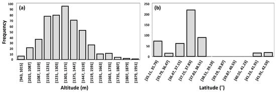 Histograms showing (a) vertical and (b) horizontal distribution rankings. The histograms were plotted based on the altitude and latitude of the survey plots.