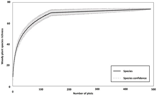 To determine whether appropriate quadrants were set up within the study sites, species area curves were analyzed [36]. In the species area curves that estimate the number of species, the order of the survey plots was determined by assigning a serial number to each of the 490 plots and then randomly allocating a number to each plot using a table of random numbers. The method used by Chao [37] was used for estimating species richness.