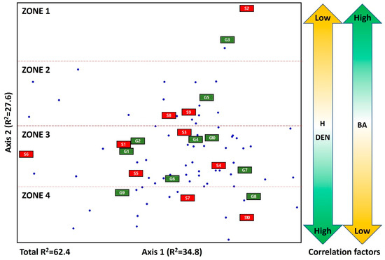 Figure 5 shows the results from the correlation analyses of ecological factors with generalist and specialist species selected based on Levin’s index (Levin’s standardized index showing niche breadth). The NMS ordination analysis results showed that the explanatory power of axis 1 was 0.348, and that of axis 2 was 0.276, with a total explanatory power of 0.624. The correlations between the 2D distribution of woody plants and ecological factors appeared as stand density, basal area at breast height (basal area; BA), and species diversity. Relative to axis 2, species diversity (H) and stand density (DEN) tended to increase towards the lower space, while BA tended to increase in the upper space. S2 and G3 were found in the upper space.