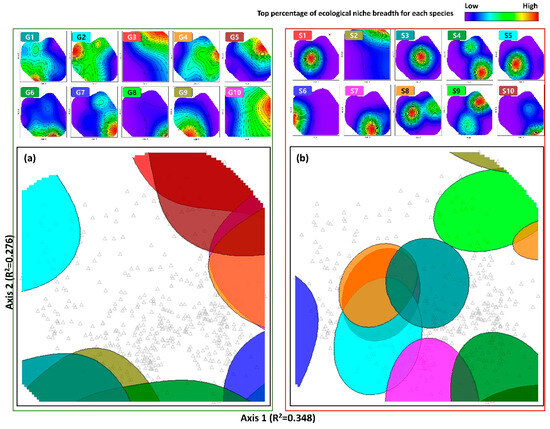 Differences in the ecological niche space of plant species ultimately reflect the differences in habitats, while plant species that have overlapping niches show similar habitats [59]. In other words, the ecological niche of a plant species is interpreted as the difference in its ability to adapt to a specific environment within an ecosystem [60].
