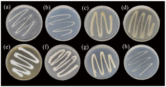 Colony morphological characteristics of strain FY4 on different media. (a) Gauze’s Medium No. 1; (b) Czapek’s Medium; (c) glucose aspartate agar medium; (d) ISP1 medium; (e) ISP2 medium; (f) ISP3 medium; (g) ISP4 medium; (h) ISP5 medium.