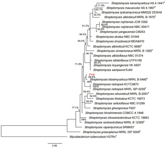 Maximum-likelihood tree obtained from the combined 16s rRNA, atpD, rpoB, and trpB genes of strain FY4. Mycobacterium tuberculosis H37Rv was used as the outgroup. Numbers at the branches indicate the percentage of replicate trees in which associated taxa clustered in the bootstrap test (1000 replicates).