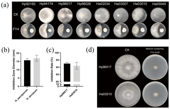 The fermentation broth of FY4 significantly inhibited the mycelial growth of Heterobasidion spp. At a 10% broth concentration, the inhibition rates reached 92.54% ± 0.93% and 91.01% ± 2.32% for strains Hp96017 and Ha03010, respectively, compared to the control group (Figure 3c,d).