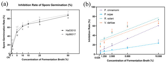 Similarly, the inhibition rate of spore germination increased with increased fermentation broth concentration (Figure 4a). At a 50% concentration, the spore germination inhibition rates reached 87.09% ± 1.72% and 89.84% ± 3.40% for Heterobasidion strains Ha03010 and Hp96017, respectively.