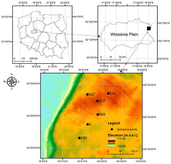 Location of research plots and digital terrain model (m a.s.l.—meters above sea level).
