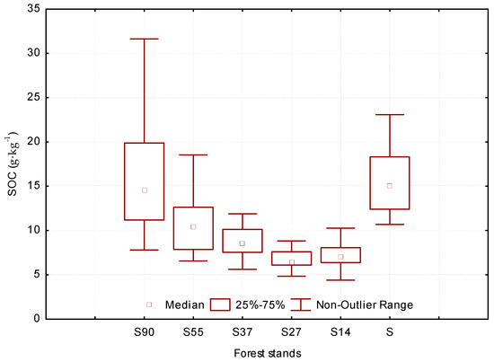 The contents of SOC in the organic horizon increased with the age of the stand, and amounted to 234.0, 251.6, 255.0, 265.0 and 293.0 g·kg−1 in the 14-, 27-, 37-, 55- and 90-year-old stands, respectively. The SOC contents in the A layer across all analyzed soil samples during the measurement period varied from 4.84 to 31.43 g·kg−1 (Figure 2). There was considerable variability in the SOC content in the soil upper horizon among the research plots, as indicated by a coefficient of variation (CV) of 49.1%.